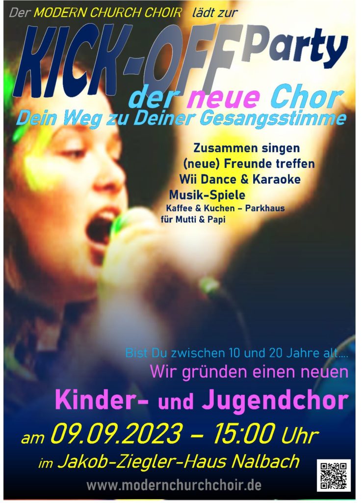 ENDLICH…..es ist soweit, wir gründen einen Kinder und Jugendchor. Für Kinder und Jugendliche zwischen 10 und 20 Jahren. Wir singen Rock, Pop, Soul und auch Gospels. Zur „Kick-OFF“ Veranstaltung treffen wir uns am Samstag den 9.September 2023 im Jakob-Ziegler-Haus in Nalbach im Jakob-Ziegler-Weg. Die Veranstaltung geht von 15.00 Uhr bis 18.00 Uhr. Es erwartet dich ein aufregender Nachmittag mit Gesang, Karaoke und vielem mehr. Es gibt Kaffee und Kuchen und auch andere Getränke. Wir lernen uns kennen und werden nach diesem Tag immer Donnerstags um 17.30 Uhr proben. Komm und sei dabei….